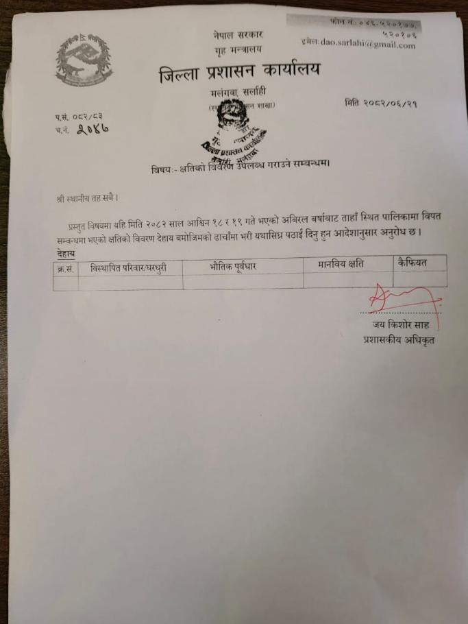 क्षतिको विवरण उपलब्ध गराई दिने सम्बन्धमा |