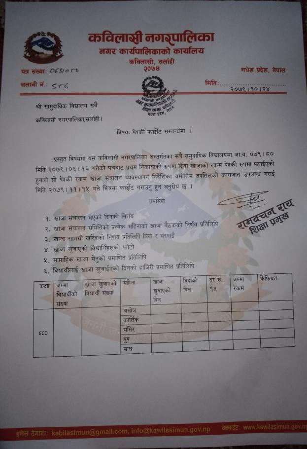कविलासी नगरपालिका अन्तर्गत रहेका सम्पूर्ण बिद्यालयहरुको लागि पेश्की फर्छौट सम्बन्धी सूचना |