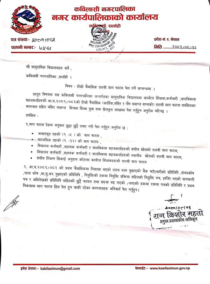 » दोस्रो त्रैमासीक तलबी माग फराम पेश गर्ने सम्बन्धी सूचना ।