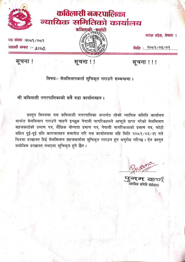 मेलमिलापकर्ता सुचिकृत गराउने सम्बन्धी सूचना |